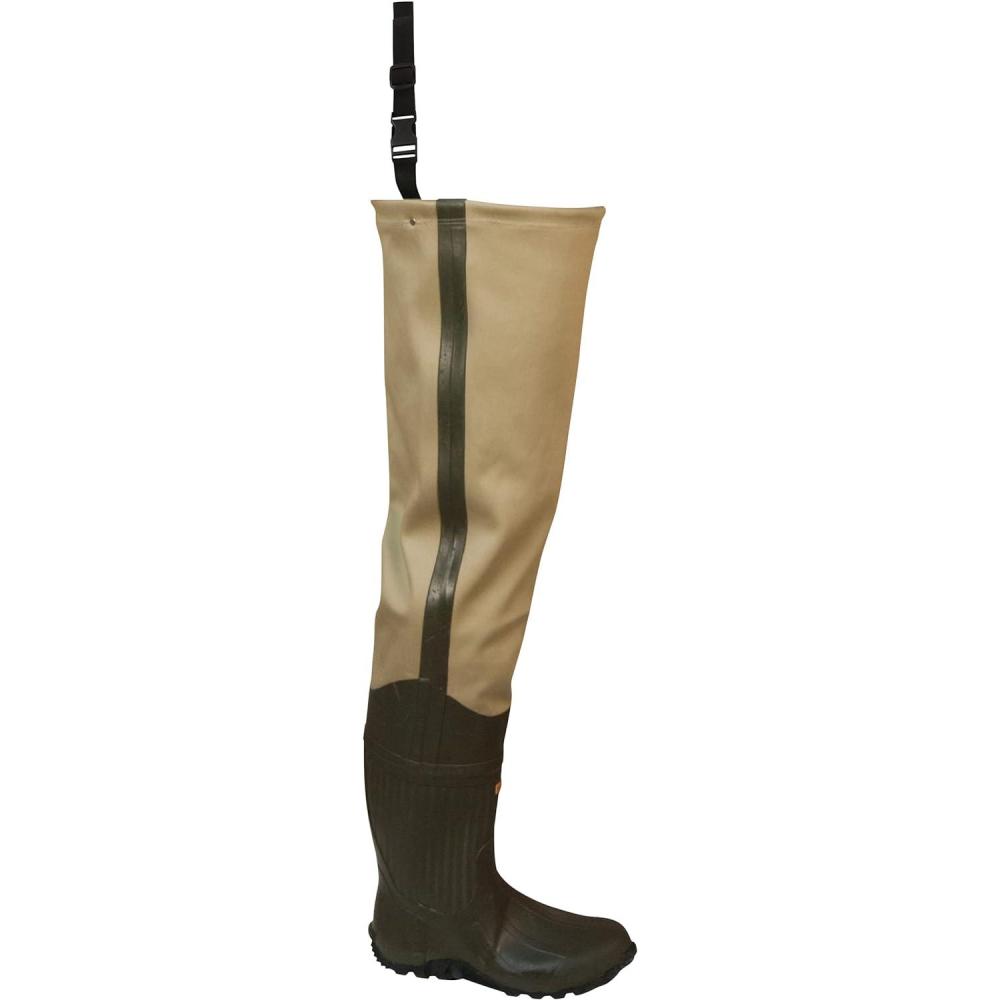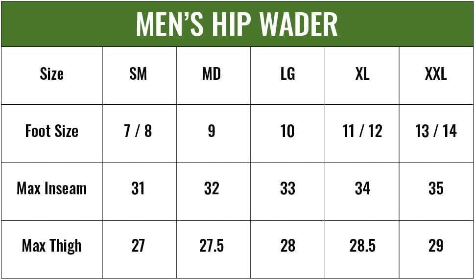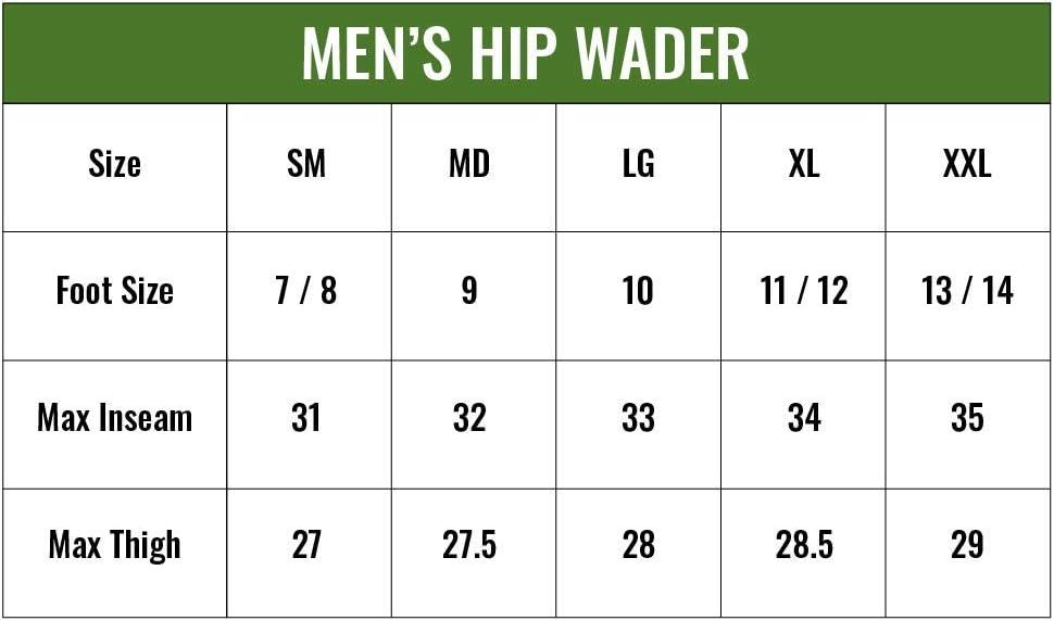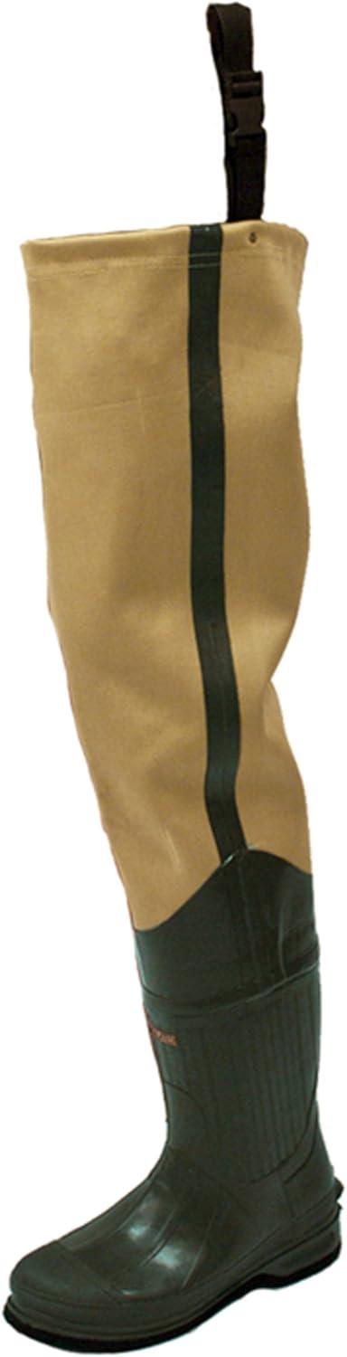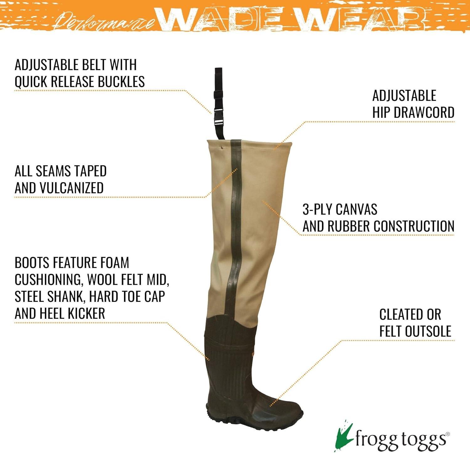 The Frogg Toggs Bull Frogg 3-ply PVC Canvas Bootfoot Hip Wader features a tough, durable 3-ply canvas and vulcanized rubber construction with all seams taped and vulcanized for strength. An adjustable belt leashes with quick-release buckles and an adjustable hip drawcord provide a secure and comfortable fit. The attached boots feature foam cushioning, wool felt mid, steel shank, hard toe cap and heel kicker. The wader comes with a cleated or felt outsole.