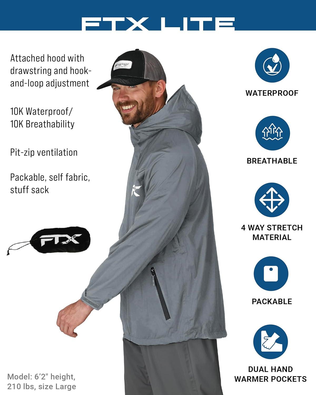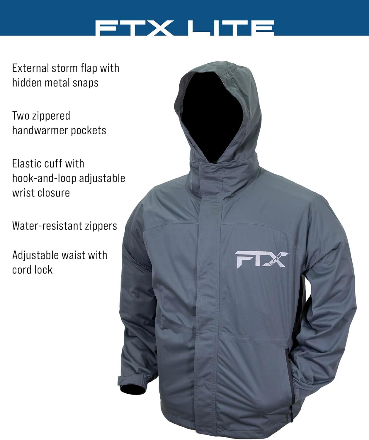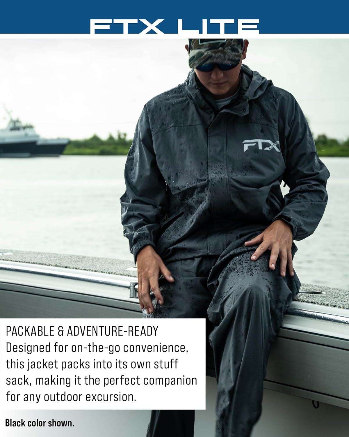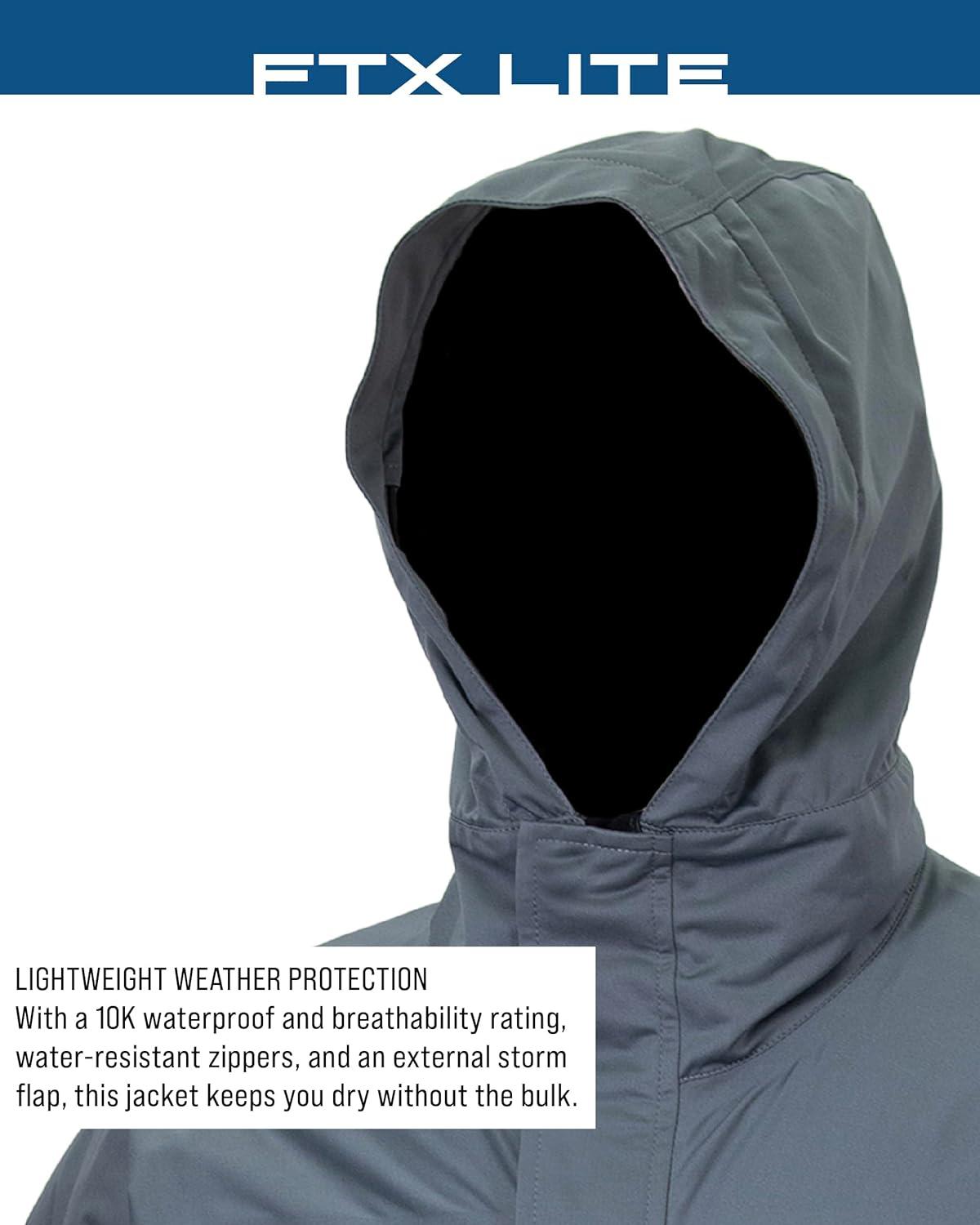 Decades of research, design and development have landed on perfection in the FTX Lite series. An angler’s perfect waterproof outerwear choice brings you a light, packable, portable, and extremely comfortable fishing rain jacket at an affordable price. 10k waterproof/breathability rating, 4-way stretch, ultralight, full front water-resistant zip closure with snap storm flap, attached hood with drawstring closure, pit zips, two handwarmer pockets, adjustable wrist, adjustable waist with locking drawcord, storage/stuff sack