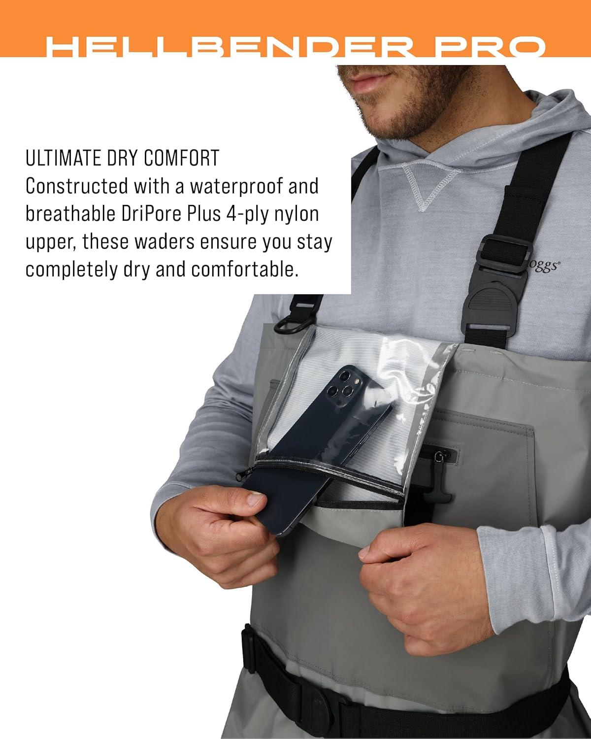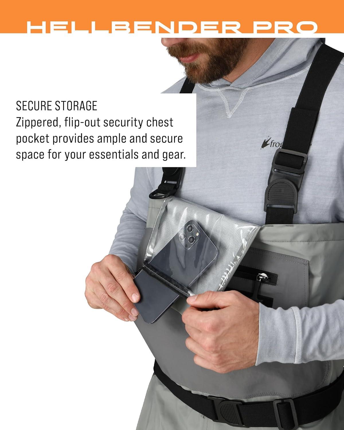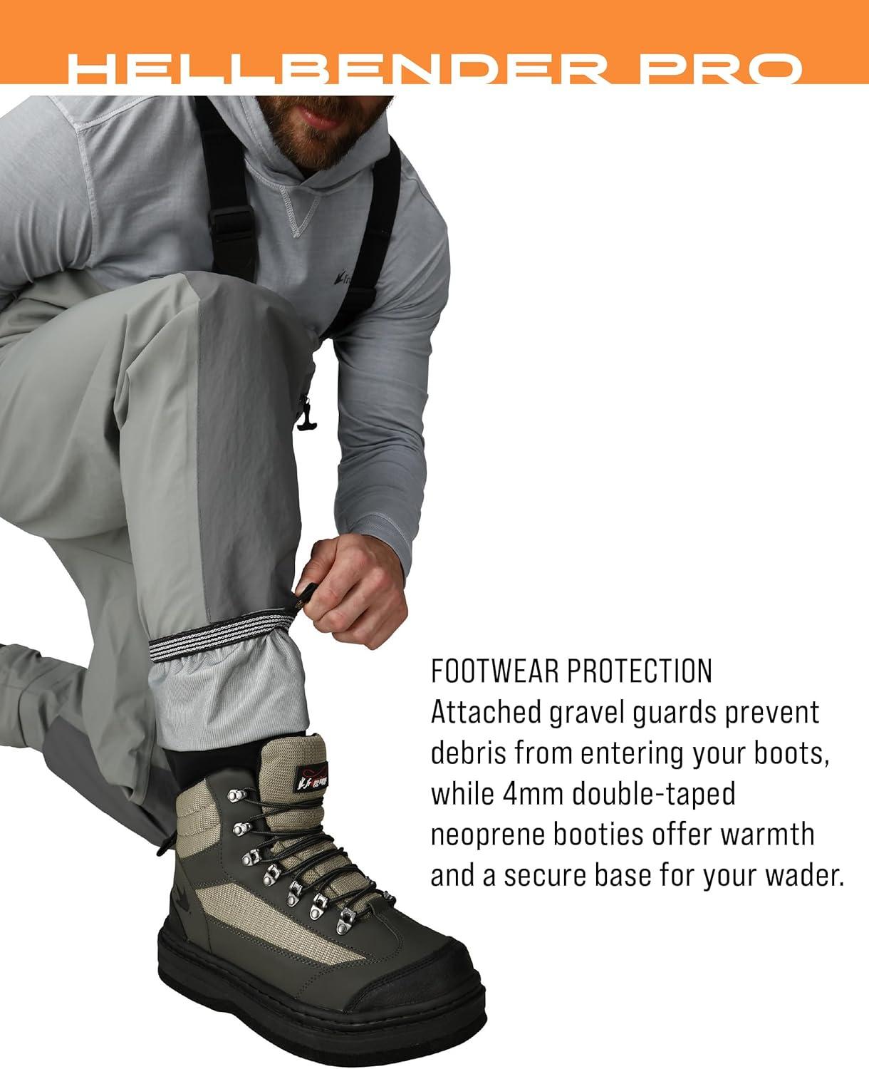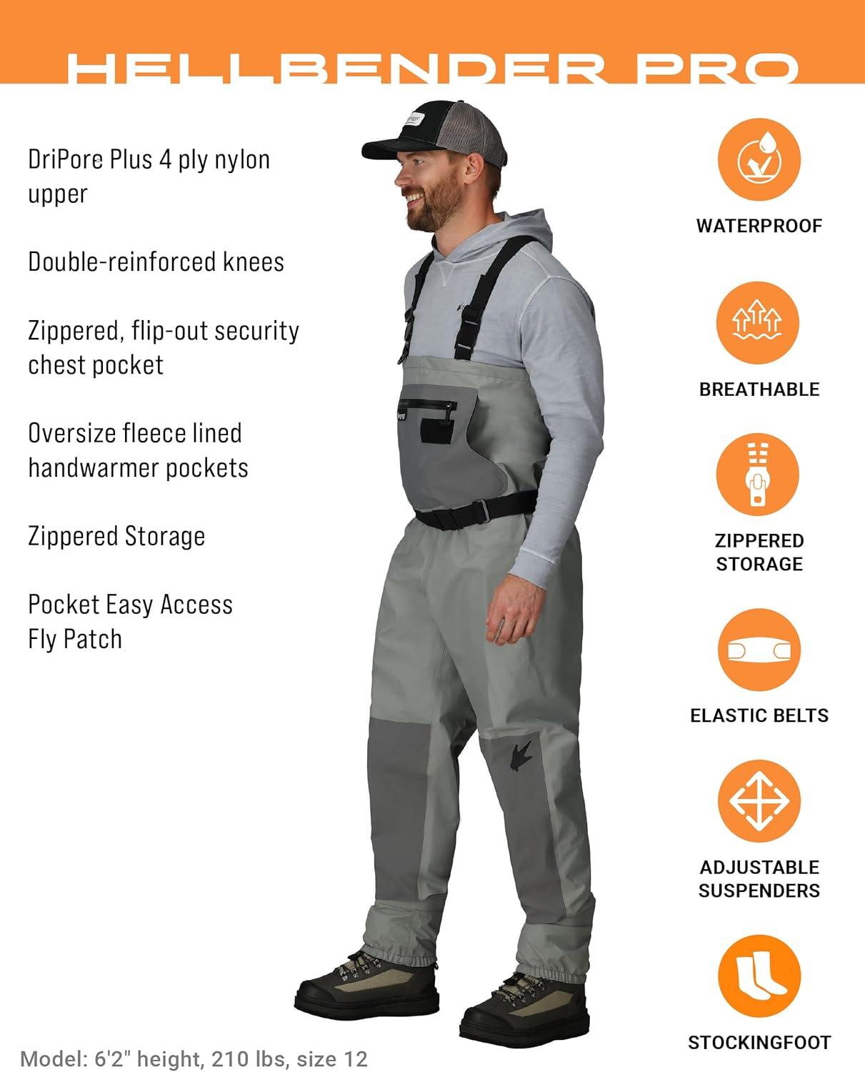 The Hellbender Pro features 100% waterproof protection with rugged and durable 4mm Double-Taped Neoprene booties with attached gravel guards. DriPore Plus upper with double reinforced knees for lightweight, breathable, abrasion resistant protection. Customize your fit with adjustable X-Back suspenders and wading belt with quick release buckles. A secured zippered front pocket and flip out security pockets keeps your essential at hand.