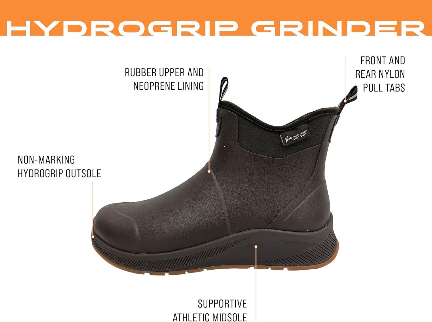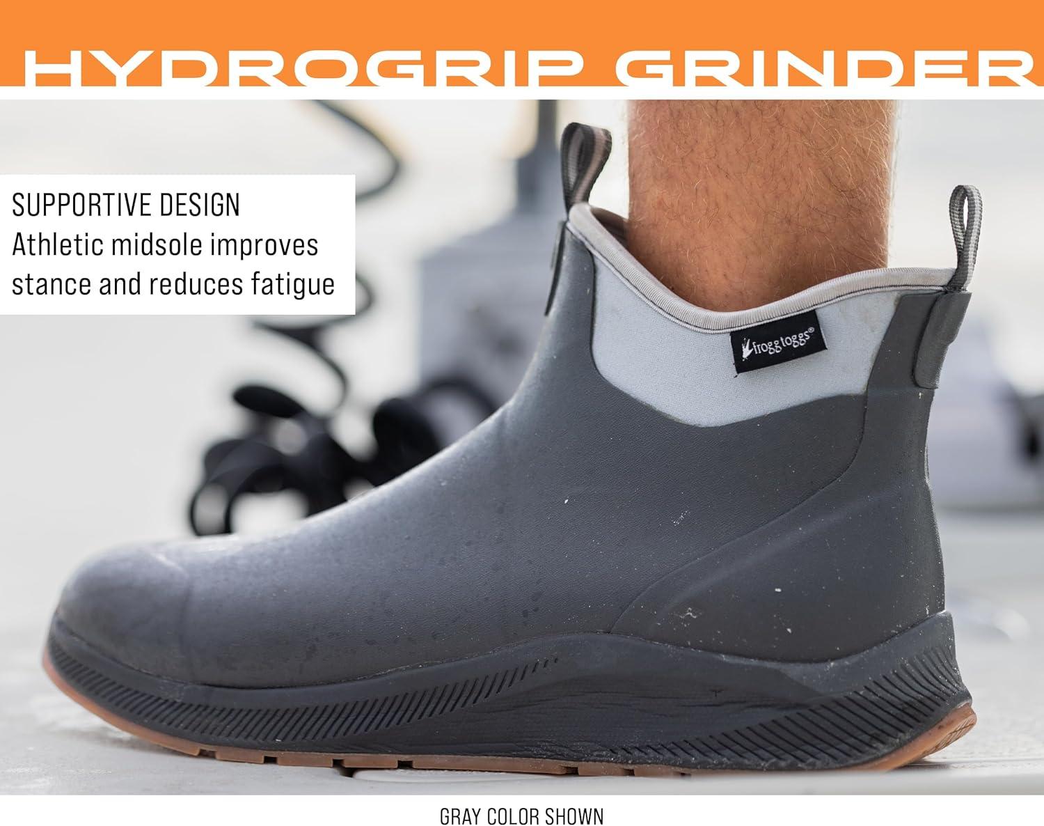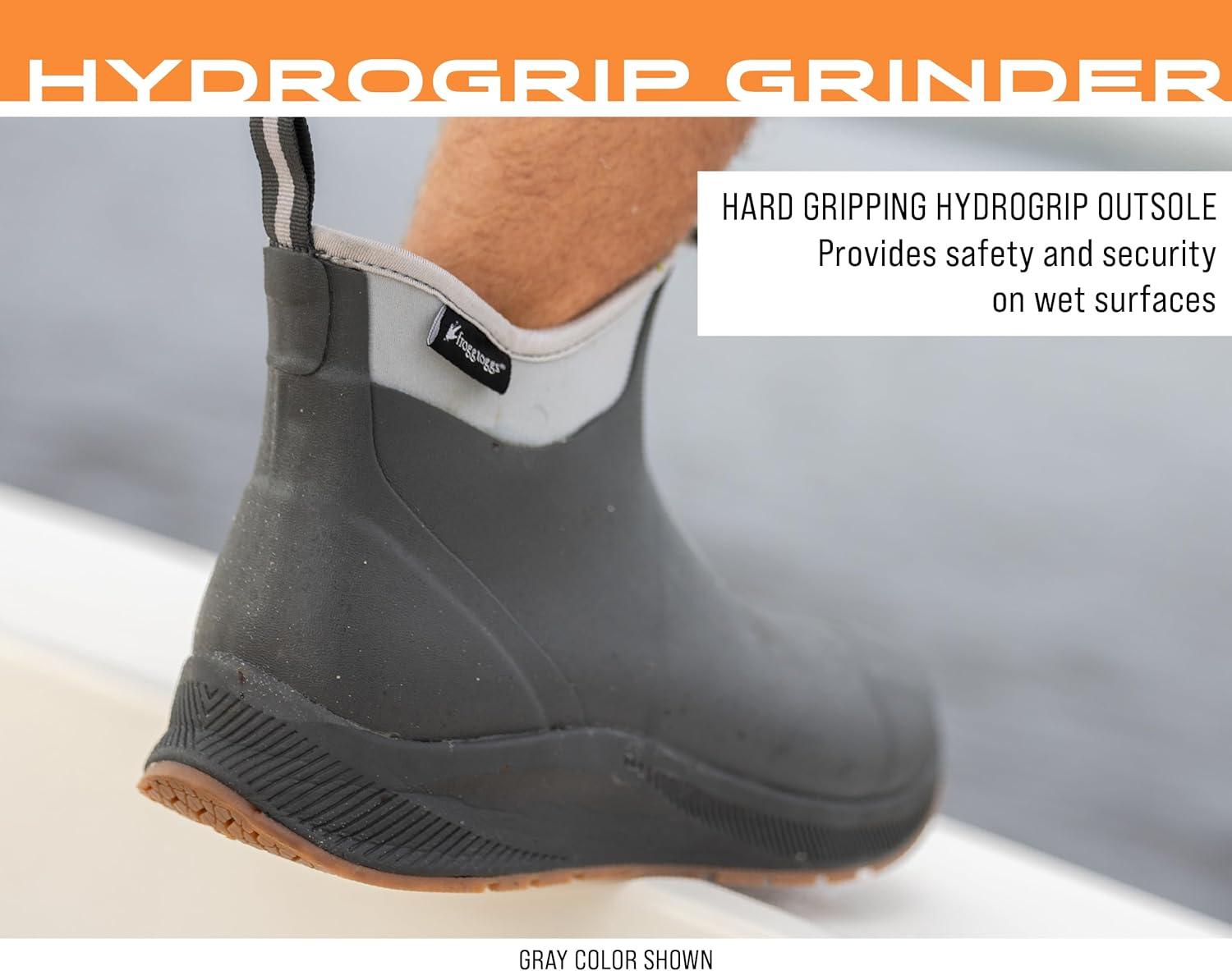 The Hydrogrip Grinder Insulated deck boot elevates comfort, performance, support, grip, and durability. The Hydrogrip Grinder is the deck boot the world has been waiting for. Boot features an exclusive non-marking and hard-gripping Hydrogrip outsole, a supportive, athletic midsole that improves stance and reduces fatigue from long days on the water, is fully neoprene lined for comfort and warmth, a slop-free athletic fit for more stability on uneven surfaces and rough seas, and the 100% waterproof performance you expect from Frogg Toggs.