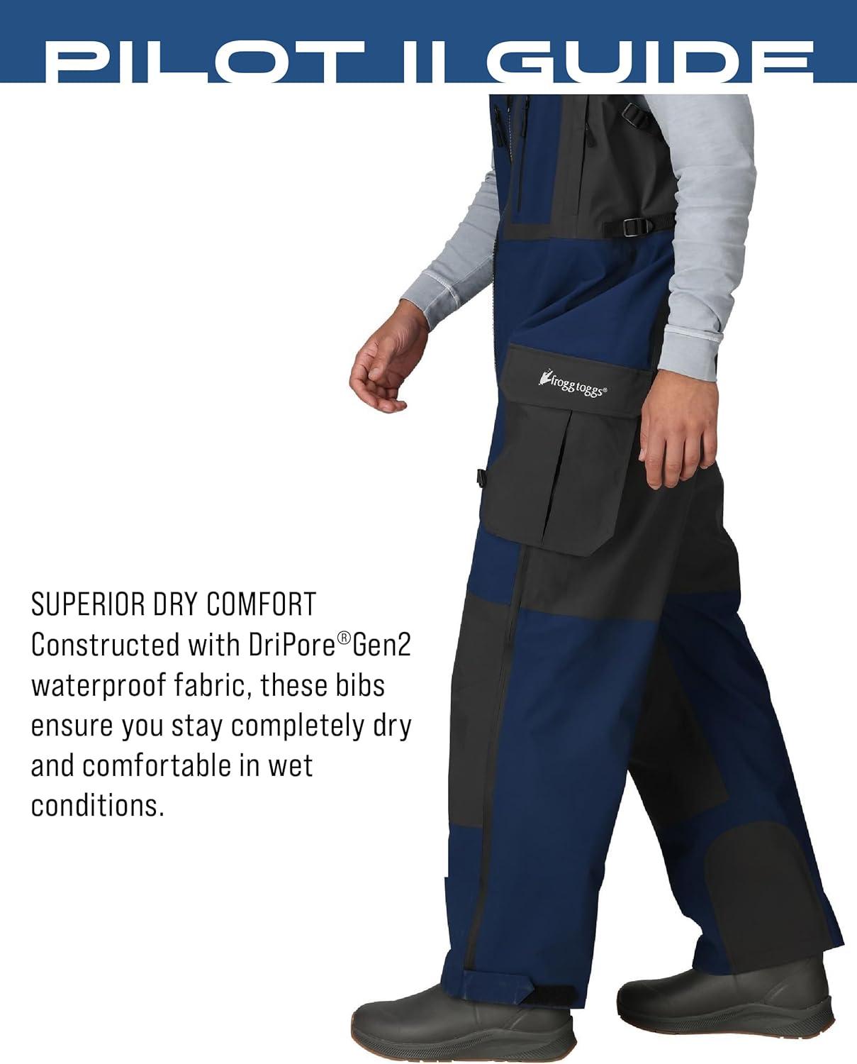 The Frogg Toggs Pilot II Bib is the perfect hunting and fishing companion. Comfort-stretch suspenders with locking buckles allow for a comfortable wear and multiple accessory D-rings provide added convenience. Zippered chest-storage pockets and quick-drain, expandable cargo pockets provide ample storage. The internal waist adjustment allows the wearer to achieve the perfect fit and zip-to-knee side zips for easy on and off make the Pilot II Bib easy to use and easy to love!